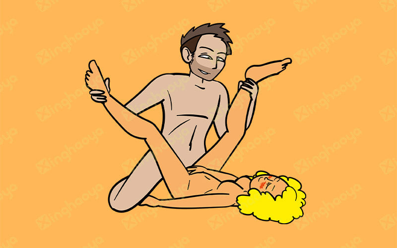 Sexual relationships that are constantly updated will last. This requires one party to actively stimulate the other's desires and give sex new vitality. Only in this way can your life be stable and long-lasting. The woman lies on her back, legs are straight and lifted up. The male partner sits down on his knees next to the woman’ buttocks, legs are driven wide. With his hands, the man takes his partner’s ankles and spreads her legs apart, he sees very exciting view. With one hand the woman caresses her crotch, the other one she puts on the male partner’s thigh and gently strokes it.